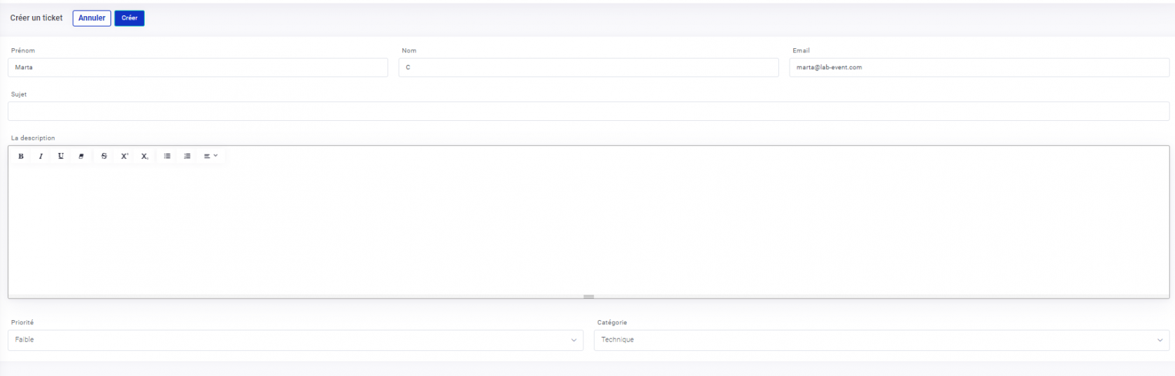 Vous aurez aussi la possibilité de définir la Priorité (faible, moyen, haut) et la Catégorie (technique, facturation, service client) du ticket que vous créez.